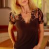 Aurora blouse is a combination of microfiber with lace and comfort with elegance. The floral motif on the lace and slightly gathered short sleeves add a romantic charm to the blouse. The delicate, elastic microfiber fits perfectly on the body, and the fitted cut and deep neckline beautifully emphasize the silhouette. This unique blouse will add character to any styling.