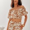 Blouse Noemi is the essence of summer lightness and feminine charm. The Spanish neckline sensually exposes the shoulders, adding a subtle sensuality to the silhouette, while the short, puffy sleeves introduce a touch of romance and delicacy. The crop cut with an elastic band at the waist beautifully accentuates the figure, creating a fresh, girly look that is perfect for a beach stroll or summer gatherings with friends. Made of a light, breathable fabric blend of viscose and cotton, the blouse ensures exceptional comfort even on the hottest days. Softly enveloping the body, it provides a feeling of freedom, freshness, and natural elegance. It is the perfect choice for women who appreciate style but do not want to compromise on comfort. The product is designed and made in Poland.