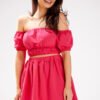 A short blouse with short sleeves and a striking Spanish neckline, which subtly reveals the shoulders. Finished with elastic bands at the waist, sleeves, and neckline, ensuring a better fit to the silhouette and comfort of wearing. Light and feminine, perfect for summer days and evening outings.