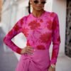 Tulle blouse with long sleeves is a unique element of the wardrobe that combines lightness and elegance. Made of delicate material, subtly emphasizes the silhouette, giving the styling a fancy character. The round neckline provides a classic and universal look, and the colorful print on the fabric adds originality and expressiveness to it. Perfect for both everyday wear and special occasions, it pairs well with elegant skirts and casual jeans.