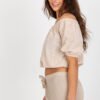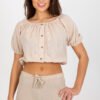 A daily boho-style blouse, perfect for summer days and casual, feminine stylings. Made of breathable, natural cotton, ensuring comfort all day long. A model with a short length and a sensual off-the-shoulder neckline that beautifully showcases the shoulders and adds lightness to the entire silhouette. The blouse has short sleeves and amazes with its dominant, lace embroidery, emphasizing the boho character of the design. Additional decoration includes decorative buttons at the front, adding a subtle and stylish touch to the whole look. An ideal choice for everyday outings, walks, or summer meetings.