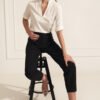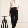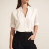 Made of high-quality viscose, the blouse will work perfectly in soft office stylizations. It goes well with black high-waisted cigarette pants and pencil skirts. The blouse has unusual ruching that gives the neckline a unique look, as well as rolled-up sleeves. The loose fit sits well on the silhouette.