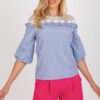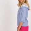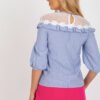 Elegant blouse of standard length, made of natural cotton, combining a classic striped pattern with subtle, feminine details. The neckline is adorned with delicate lace and a charming ruffle, which add lightness and a romantic character to the whole. Puffy 3/4 sleeves introduce a trendy accent, and the lack of fastening ensures comfort when wearing. A perfect model for both work and formal occasions, it pairs well with elegant trousers or a skirt.