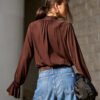 Model Isabel is a viscose blouse distinguished by an elegant tie under the neck and decorative ruffled cuffs. The light, breathable fabric combined with a loose cut ensures comfort and subtly emphasizes the silhouette. Carefully sewn in Poland, it combines classic elegance with a modern character. Isabel will work well both in office stylizations with elegant trousers and in evening sets with a fitted skirt. Designed and made in Poland.
