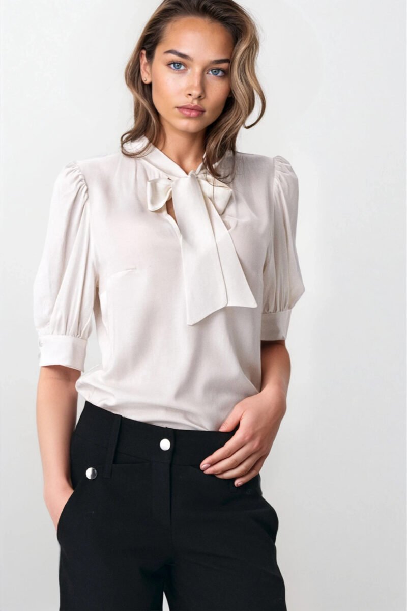 The elegant blouse with a tie at the neckline is the perfect accent in soft-office stylizations. The puffy sleeve up to the elbow adds grace and uniqueness to the style. The pleasant to the touch material, made of one hundred percent viscose, ensures high wearing comfort.