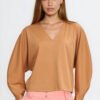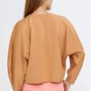 Stylish oversized blouse made of soft material with a touch of viscose, providing comfort. The V-neck subtly elongates the neck, adding lightness to the styling. Long sleeves are an original combination of balloon and batwing style, giving the whole a unique character. The shorter length makes the blouse look great with high-waisted bottoms. The seam in the middle of the front adds a minimalist accent. A model put on over the head, perfect for everyday wear and special occasions.