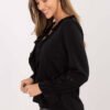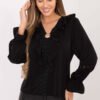 An elegant women’s blouse is a stylish proposition that will work perfectly for formal occasions as well as for work or everyday wear. Its classic form has been enriched with decorative details, making it look exceptionally feminine and elegant. The model made of a blend of viscose, polyester, and elastane guarantees comfort, flexibility, and a beautiful fit to the silhouette. The smooth dominant pattern makes the blouse versatile and pairs well with both elegant bottoms and everyday wardrobe elements. The blouse has a standard length and long sleeves finished with a subtle ruffle, adding a delicate, feminine character to the overall look. The V-neck visually slims the neck, and the lack of a traditional fastening ensures exceptional comfort. Its charm is enhanced by lace inserts on the front and sleeves, creating an elegant and romantic accent. Additionally, the model features a decorative jabot and a striking brooch, highlighting the formal, stylish character of the blouse. This is an ideal proposition for women who appreciate elegance, subtle details, and everyday comfort.