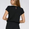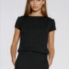 Stylish blouse with a fitted fit, which effectively emphasizes the silhouette. Made of soft knit fabric decorated with black sequins, it gives the styling an elegant and modern character. The boat neckline subtly highlights the neck and shoulder line, adding lightness to the whole. The short sleeve with delicate ruching is a decorative accent and highlights the feminine style. The model put on over the head ensures comfort and convenience. An ideal proposition for both evening outings and elegant everyday stylizations.