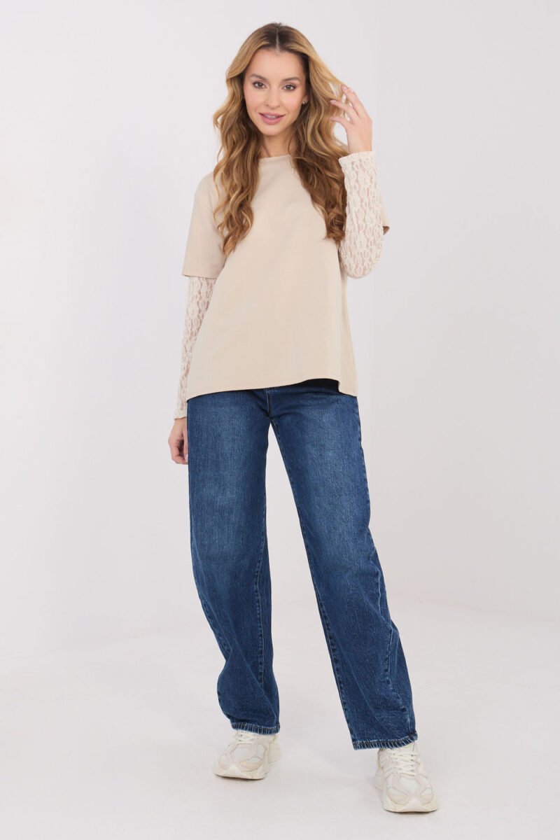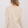 The daily women’s blouse with a casual character combines simplicity with a delicate, feminine accent. Made of high-quality blend of cotton, nylon, and elastane, it is pleasant to the touch, breathable, and flexible, ensuring comfort throughout the day. The smooth material emphasizes the blouse’s universal style, making it perfect for everyday stylizations. The model has a standard length and a round neckline, which adds classic elegance. The 3/4 sleeves made of delicate lace introduce a subtle, eye-catching detail, distinguishing the blouse from classic options. It is an ideal choice for women who appreciate comfort combined with a feminine finish.