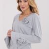 Elegant longsleeve blouse with a fitted cut, which effectively emphasizes the silhouette and combines classic with decorative details. Made of high-quality cotton, it provides comfort and pleasant fit throughout the day. The smooth patterned model has a V-neckline, which subtly exposes the neck and adds a feminine character. The bell sleeves give the whole lightness and elegance, and decorative fabric flowers placed on the sleeves and at the neckline are a unique decorative accent. The standard length makes the blouse perfect for everyday stylizations, for work, for formal meetings, as well as for elegant outings or parties.