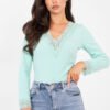 The fitted everyday blouse is the perfect choice for women who value comfort combined with subtle elegance. The casual style model will work great for both everyday wear and work, creating aesthetic and feminine stylizations. The smooth pattern and ribbed material structure give the blouse a modern, yet versatile character. The blouse is made of a flexible and pleasant to wear polyester and elastane blend, which ensures comfort and a good fit to the silhouette. The standard length makes the model perfectly match with trousers and skirts of different styles. Stylish accents are the long sleeves finished with delicate lace and a V-neckline trimmed with lace, adding feminine charm and lightness to the whole look. The lack of fastening emphasizes the simplicity of the cut and comfort of wearing. This is a blouse that combines everyday comfort with elegant details, perfect for many stylizations.