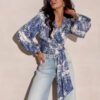 Stylish blouse with a wrap-around design featuring an eye-catching tie at the waist subtly accentuates the silhouette and catches the eye with a decorative pattern. The thoughtful cut combines feminine elegance with comfort, ensuring all-day wearability. The model has been carefully designed and sewn in Poland, with attention to detail and high quality finishing. The blouse will work perfectly in both elegant stylings with material trousers and heels, as well as in everyday outfits with jeans and flat shoes.
