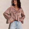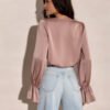 Elegant blouse with a loose fit, V-neckline and decorative bow at the neck. Slightly flared cuffs add lightness and subtle femininity, while comfort goes hand in hand with aesthetic finishing. The model was carefully sewn in Poland, with great attention to detail and high quality workmanship. The blouse will perfectly complement both elegant office stylizations with a blazer, trousers or skirt, as well as everyday sets with light jeans.