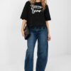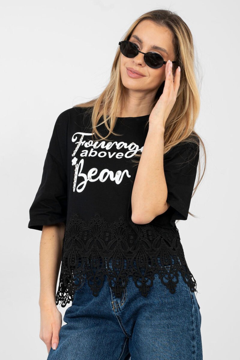 Everyday women’s blouse with a feminine and stylish character. Made of high-quality cotton with a touch of elastane, it provides comfort, flexibility, and a good fit to the silhouette. A model with a short length and short sleeves will work great on warmer days. The round neckline emphasizes the classic cut and gives the blouse a universal look. Decorative inscriptions on the front, complemented by zircons, attract attention and give the whole a fashionable accent. An additional advantage is the lace at the bottom of the blouse and subtle zircons, which add a feminine glow to it. Perfect for everyday styling with jeans, shorts, or a skirt.