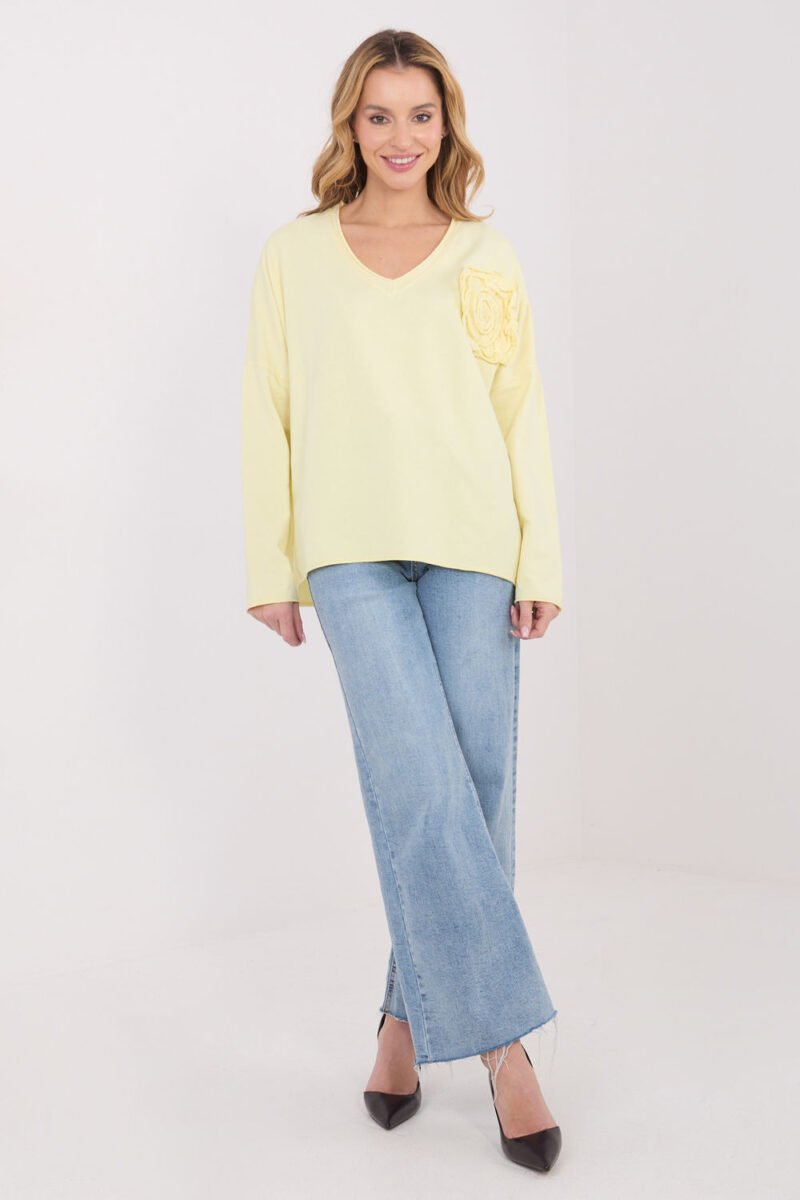 Casual everyday blouse, combining comfort with subtle, feminine detail. Made of soft cotton with a touch of elastane, it ensures comfortable wear and a slightly fitted cut. The standard length model has long sleeves and a V-neckline, which subtly exposes the neck. The dominant decoration is an application in the form of an embroidered flower, giving the blouse a delicate, stylish accent. An ideal proposition for everyday, casual stylizations that combine comfort with feminine grace.