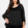 Elegant blouse of standard length, perfect for work and formal occasions, combining stylish look with comfort. The model made of a blend of tencel and polyester provides a pleasant softness and durability of the material. The blouse has a classic, round neckline and 3/4 sleeves, and the smooth pattern gives it a versatile character. An additional advantage is the lining in the central part, which subtly shapes the silhouette and ensures an elegant fit under clothing. Ideal for both office outfits and more formal outings.