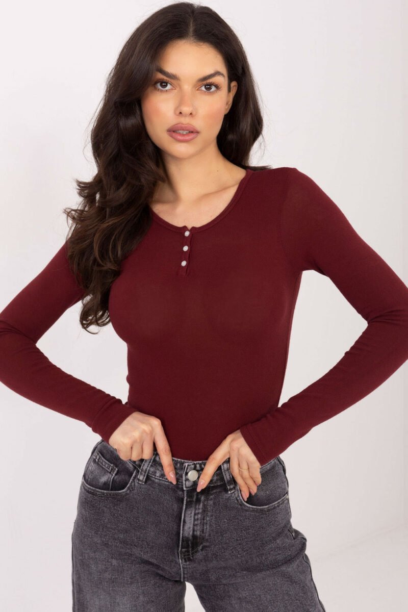 The fitted women’s longsleeve blouse is a universal proposition that works perfectly in everyday stylings and at work. The casual character of the model makes it easy to combine it with both jeans and elegant trousers or a skirt. The short cut emphasizes the silhouette and goes well with high-waisted clothing. The smooth pattern gives the blouse a minimalist, timeless look, making it an ideal base for many outfits. The model is made of high-quality cotton, which provides comfort, breathability, and a pleasant fit to the body. The blouse has long sleeves and a classic, round neckline fastened with three buttons. This subtle detail adds a feminine character and allows to delicately adjust the depth of the neckline. It is a practical and stylish wardrobe element that will work throughout the year.