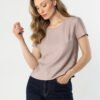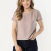 A light blouse with a simple, loose cut is a universal wardrobe piece that works great in everyday stylings. The round neckline subtly accentuates the neck, while the short sleeves provide comfort and ease of wear. The looser fit gently drapes on the silhouette, ensuring comfort throughout the day. The smooth fabric with a subtly satin finish adds an elegant character to the whole, making the blouse perfect for both jeans and more classic pants or skirts.