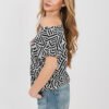 Stylish everyday blouse is a perfect choice for women who value comfort and a trendy look in their daily stylings. Thanks to its universal cut, it will work great both paired with jeans, shorts, and a skirt. The model is made of pleasant to the touch viscose, which is light, airy, and comfortable to wear even on warmer days. The blouse has a round neckline and short sleeves, giving it a casual, laid-back character. The material features a print, which is the main decorative element adding a trendy look to the whole outfit. The blouse has a standard length, making it fit well on the silhouette and easy to match with various wardrobe items. The model is put on over the head without any fastening, which increases comfort of use. This practical and stylish proposal is perfect for everyday wear, ideal for many daily stylings.