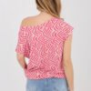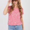 Stylish everyday blouse is the perfect choice for women who appreciate comfort and a fashionable look in their daily stylings. Thanks to its universal cut, it will work great in combination with jeans, shorts, and skirts. The model is made of pleasant to the touch viscose, which is light, airy, and comfortable to wear even on warmer days. The blouse has a round neckline and short sleeves, giving it a casual, casual character. The fabric features a print, which is the main decorative element and adds a fashionable look to the whole. The blouse has a standard length, so it fits well on the silhouette and can be easily matched with different wardrobe items. The model is put on over the head without fastening, which increases the comfort of use. This is a practical and stylish proposition for everyday wear, perfect for many daily stylings.