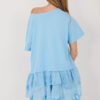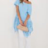 Unique women’s boho style blouse that combines comfort with subtle, feminine elegance. The longer cut model has a classic, round neckline and short sleeves, providing comfort and freedom of movement. The blouse features a smooth pattern, emphasizing its minimalist yet stylish character. Made of natural cotton, it is soft, breathable, and pleasant for the skin, making it perfect for warmer days. A special decoration of the model is the sewn-on asymmetrical, embroidered ruffle at the bottom, which adds lightness to the overall look and emphasizes the boho character of the blouse. This is an ideal choice for everyday styling, looking great with both jeans and leggings or fitted pants.