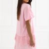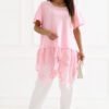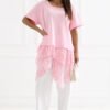 Unique women’s boho style blouse that combines comfort with subtle, feminine elegance. The longer cut model features a classic, round neckline and short sleeves, providing comfort and freedom of movement. The blouse is kept in a smooth pattern, emphasizing its minimalist yet stylish character. Made of natural cotton, it is soft, breathable and pleasant for the skin, making it perfect for warmer days. A special feature of the model is the attached asymmetrical, embroidered ruffle at the bottom, which adds lightness to the whole and emphasizes the boho character of the blouse. It is an ideal choice for everyday styling, perfect with both jeans, leggings, or fitted pants.