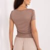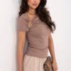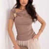 Stylish, fitted women’s blouse is a stylish proposal that will work perfectly for everyday wear, work, as well as for formal outings or parties. Its smooth pattern gives the whole a timeless character and allows for easy combination with various wardrobe elements. The model is made of a combination of viscose and elastane, thanks to which the material is soft, pleasant to the skin and elastic, ensuring a perfect fit to the silhouette. Standard length and short sleeves make the blouse comfortable and versatile. The flowing neckline adds elegance and subtle femininity to the whole, while gatherings with a decorative metal detail at the neckline are an eye-catching accent that attracts attention. The lack of fastening emphasizes the minimalist character of the model and increases wearing comfort. It is a perfect choice for women who appreciate elegance, comfort, and modern style in one.