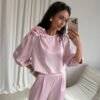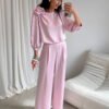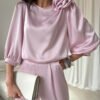 Giana blouse is an elegant proposal made of high-quality satin fabric, which gently reflects the light, adding a subtle glow to the styling. Attention is drawn to the round neckline decorated with a spectacular rose, a decorative accent that distinguishes this model and gives it a unique character. Wide 3/4 sleeves in a puffed form emphasize the shoulders, adding lightness and feminine charm to the blouse. The loose fit guarantees comfort and full freedom of movement, making this model not only stylish but also functional. Giana will work perfectly as part of elegant sets, just combine it with long satin Elsa pants, a simple blazer, and classic heels to create a chic look for special occasions. It is an ideal choice for family celebrations, holidays, receptions, or other events where you want to look classy and feel comfortable.