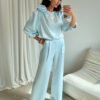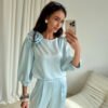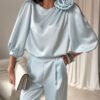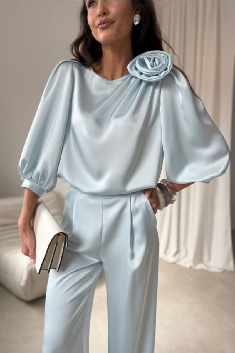 Giana blouse is an elegant proposal made of high-quality satin fabric, which delicately reflects light, adding a subtle glow to the styling. The attention is drawn to the round neckline decorated with an impressive rose, a decorative accent that distinguishes this model and gives it a unique character. Wide 3/4 sleeves in a puffy form emphasize the shoulders, adding lightness and feminine charm to the blouse. The loose fit guarantees comfort and full freedom of movement, making this model not only stylish, but also functional. Giana will work perfectly as part of elegant outfits, just combine it with long, satin Elsa pants, a simple blazer, and classic heels to create a chic look for special occasions. It is an ideal choice for family celebrations, holidays, receptions, or other events where you want to look classy and feel comfortable.