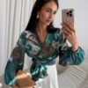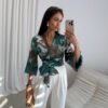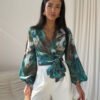 Stylish blouse with a wrap-around design with an eye-catching waist tie subtly accentuates the silhouette and attracts attention with a decorative pattern. The thoughtful cut combines feminine elegance with comfort, ensuring comfortable wear throughout the day. The model has been carefully designed and sewn in Poland, with attention to detail and high quality finishing. The blouse will work perfectly in elegant stylings with material trousers and heels, as well as in everyday sets with jeans and flat shoes.
