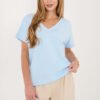 Universal blouse with a casual character, which will work perfectly both for everyday wear and for work. Its smooth cut gives it timeless elegance, making it easy to match with many outfits. Made of high-quality cotton and elastane blend, it ensures comfort and light fit to the silhouette. Standard length and short sleeve make the model perfect for any time of the year. The blouse has a stylish V-neckline both at the front and back, adding a subtle femininity. The model is without fastening, emphasizing its comfortable and minimalist character.