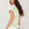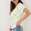 A women’s everyday blouse is a comfortable and stylish proposal for various occasions. Made of a pleasant to the touch blend of cotton and elastane, it ensures comfort, good breathability, and light flexibility, thanks to which it fits the silhouette. The model stands out with a geometric pattern, which gives it a modern and distinctive character. The standard length makes the blouse look great with both trousers and skirts. Short sleeves and a V-neck subtly emphasize the feminine silhouette, adding lightness to the whole outfit. The lack of fastening increases the convenience of use and makes the model easy to put on. This universal blouse is perfect for everyday wear, excellent for both work and less formal outings.