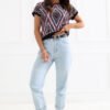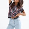 A women’s everyday blouse is a comfortable and stylish option for various occasions. Made of a pleasant to the touch blend of cotton and elastane, it provides comfort, good breathability, and slight elasticity, which allows it to adjust to the silhouette. The model stands out with a geometric pattern, which gives it a modern and distinctive character. The standard length makes the blouse look great with both trousers and skirts. The short sleeve and round neckline subtly emphasize the feminine silhouette, adding lightness to the whole outfit. The lack of fastening increases the comfort of use and makes the model easy to put on. This versatile blouse is perfect for everyday wear, excellent for both work and less formal outings.