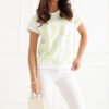A women’s everyday blouse is a comfortable and stylish option for various occasions. Made of a pleasant to the touch blend of cotton and elastane, it provides comfort, good breathability, and light flexibility, thanks to which it adjusts to the silhouette. The model stands out with a geometric pattern, which gives it a modern and distinctive character. The standard length makes the blouse perfect for both pants and skirts. Short sleeves and a round neckline subtly emphasize the feminine silhouette, adding lightness to the entire outfit. The lack of fastening increases comfort of use and makes the model easy to put on. This versatile blouse is perfect for everyday wear, excellent for both work and more informal outings.