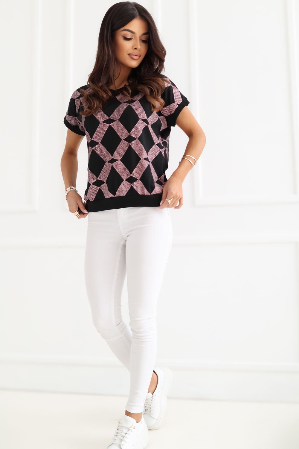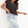A blouse with a casual character is a stylish and comfortable proposition for both everyday wear and work. Made of high-quality cotton and elastane blend, it provides comfort, breathability, and light flexibility, so it fits well to the silhouette. The model is decorated with a timeless striped pattern, which gives it a classic yet fashionable look. The standard length makes the blouse perfect for combining with various wardrobe pieces, from pants to skirts. The short sleeve and round neckline at the front emphasize its versatile character. The back attracts attention with an eye-catching V-shaped cutout and decorative bow, adding feminine charm and originality to the whole look. The lack of fastening makes the blouse comfortable and easy to put on. It is an excellent choice for women who appreciate the combination of classic style with subtle, decorative details.