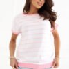 A blouse with a casual character is a stylish and comfortable proposition for both everyday wear and work. Made of high-quality cotton and elastane blend, it provides comfort, breathability, and slight elasticity, making it well-fitted to the silhouette. The model is adorned with a timeless striped pattern that gives the whole a classic yet fashionable look. The standard length makes the blouse perfect to pair with various wardrobe items, from pants to skirts. The short sleeves and round neckline at the front emphasize its universal character. The back attracts attention with an eye-catching V-shaped cutout and decorative bow, adding feminine charm and originality to the whole. The lack of fastening makes the blouse comfortable and easy to put on. It is an excellent choice for women who appreciate the combination of classic style with subtle, decorative details.
