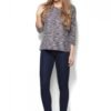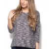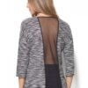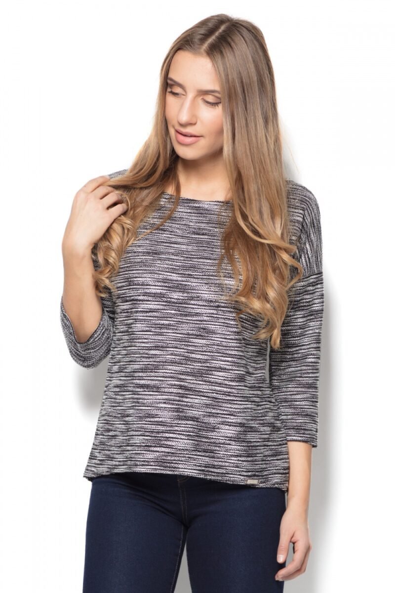 Blouse made of melange fabric with 3/4 sleeves. Loose-fitting cut with an oval neckline falling on shoulders. A very straight line with a clearly longer back adds a loose and fashionable character. The back of the blouse is decorated with a striking panel of fashionably transparent fabric.