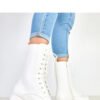 Modern white women’s work boots made of high-quality ecological leather. The model features a round toe and a 22.5-centimeter shaft that securely wraps around the ankle and adds character to any outfit. The shoes are set on a block heel with a sturdy rubber sole, providing comfort and stability while walking. The lacing combined with a zipper makes it easy to adjust and put on quickly. The interior is lined with fabric, ensuring comfort all day long. These white work boots are the perfect choice for everyday casual outfits, they pair well with both jeans and a dress or skirt in an urban style.