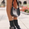 Lacquered women’s boots set on a low, wide heel and platform. The upper in the form of a sock, additionally decorated with a stylish belt with a buckle, gives them a modern character. The center is insulated with a shoe blanket only at the height of the foot. Ideal for urban styling, they combine comfort with a fashionable look.