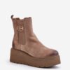 Women’s boots made of natural suede are a stylish option for colder days. Set on a massive platform with an anchor, they provide comfort and stability. The zipper located on the side of the upper makes it easy to put on, and the stiffened heel counter adds durability and support to the boots. The felt-insulated interior guarantees warmth, and the decorative element on the upper emphasizes their unique character. This model will be a perfect complement to a variety of styling.