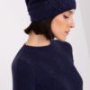 Warm women’s winter hat made of smooth knit fabric with decorative applique on the side.