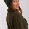 Warm winter women’s cap made of smooth knit fabric with decorative applique on the side.
