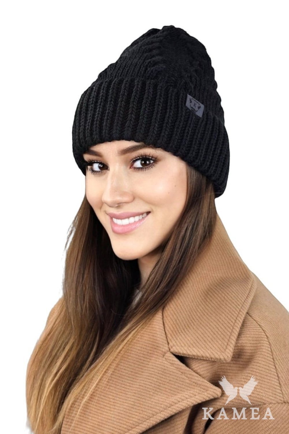 LETICIA is a luxury striped cashmere hat, available in black. Made of the highest quality yarn with the addition of cashmere and extra fine merino wool, it provides unmatched comfort and excellent warmth on cold days. The cotton lining additionally protects against the cold. The hat is decorated with a wide cuff over the forehead and a logo made of eco-leather, giving it an elegant and stylish look. Its universal design makes it an ideal addition to any outfit. Available in several color variations.