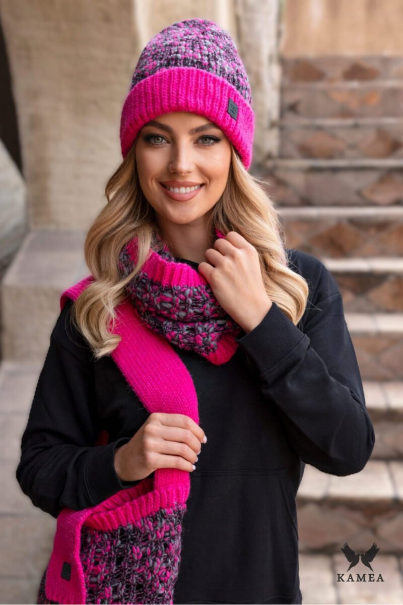 Winter shiny women’s hat MORELA in raspberry color is the perfect addition to the winter wardrobe. Made of high-quality yarn with the addition of alpaca wool, it provides warmth and comfort when wearing. The hat is characterized by a beautiful combination of colors and a delicate lurex shimmer, which adds elegance and originality to it. Finished with a wide cuff with a leather branded badge, it looks stylish and fashionable. Available in many color variants, both in bright and muted shades, it makes every woman find something for herself. MORELA is a proposal for women who value a fashionable look, comfort when wearing, and warmth during winter days.