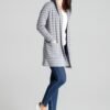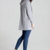Grey long knit sweater with decorative horizontal stripes and a hood. Large patch pockets at the front, without a button.