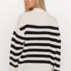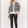 This unfussy women’s cardigan sweater is a must have in your closet. Fastened with gold buttons, the sweater looks exceptionally elegant. It has long sleeves with a low cut, and the heart neckline emphasizes the collarbones, adding feminine charm. The sweater’s distinctive pattern is thick stripes of contrasting colors, available in two color versions: ecru and black, and cappuccino and black. Choose the one that best suits your style. The sleeves are finished with a ribbed hem for comfortable wear. The sweater has a loose cut, which guarantees great freedom of movement and comfort. It is an ideal choice for colder days. Wear it as you like, with pants or over an elegant knit dress. In any version it will come out great!