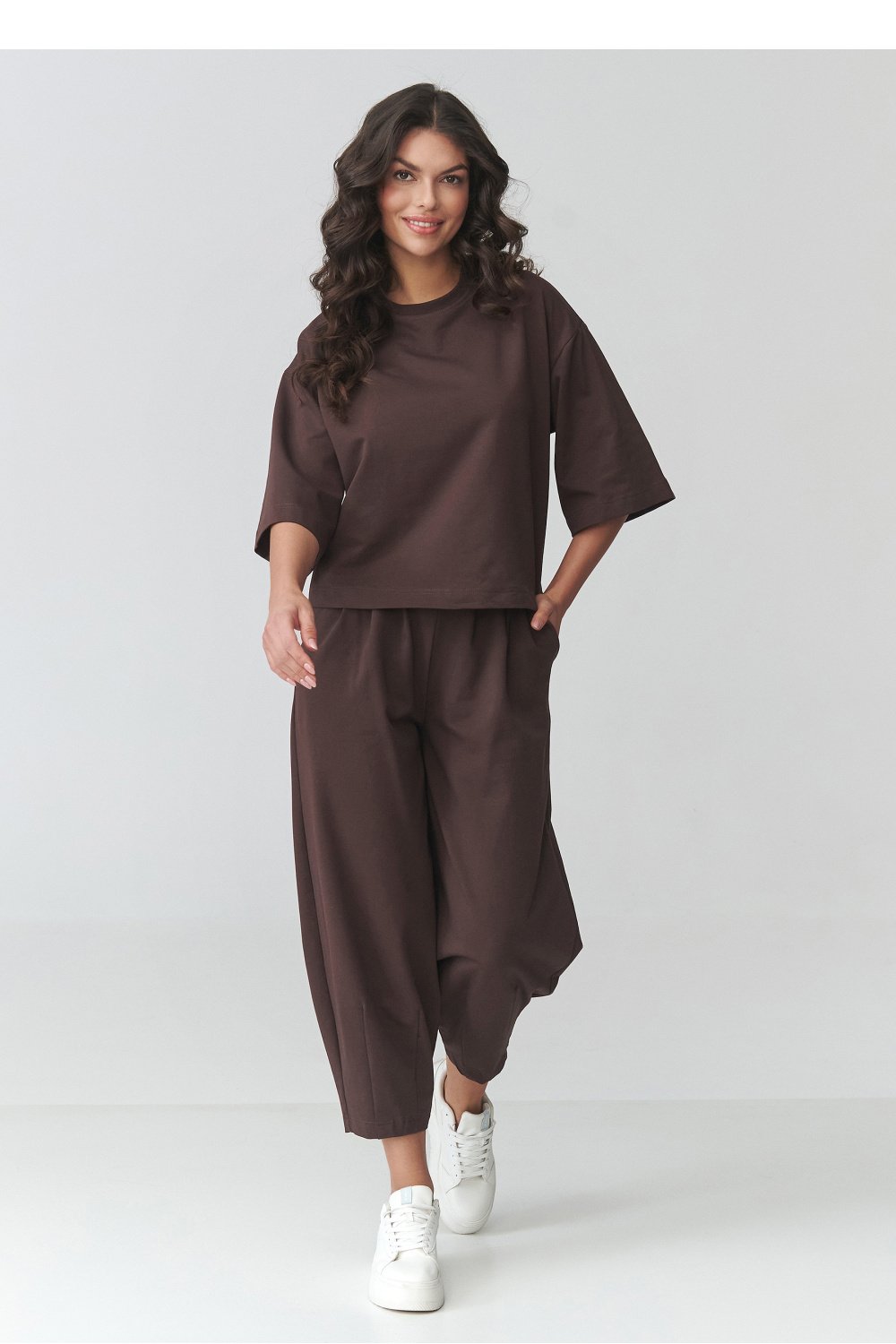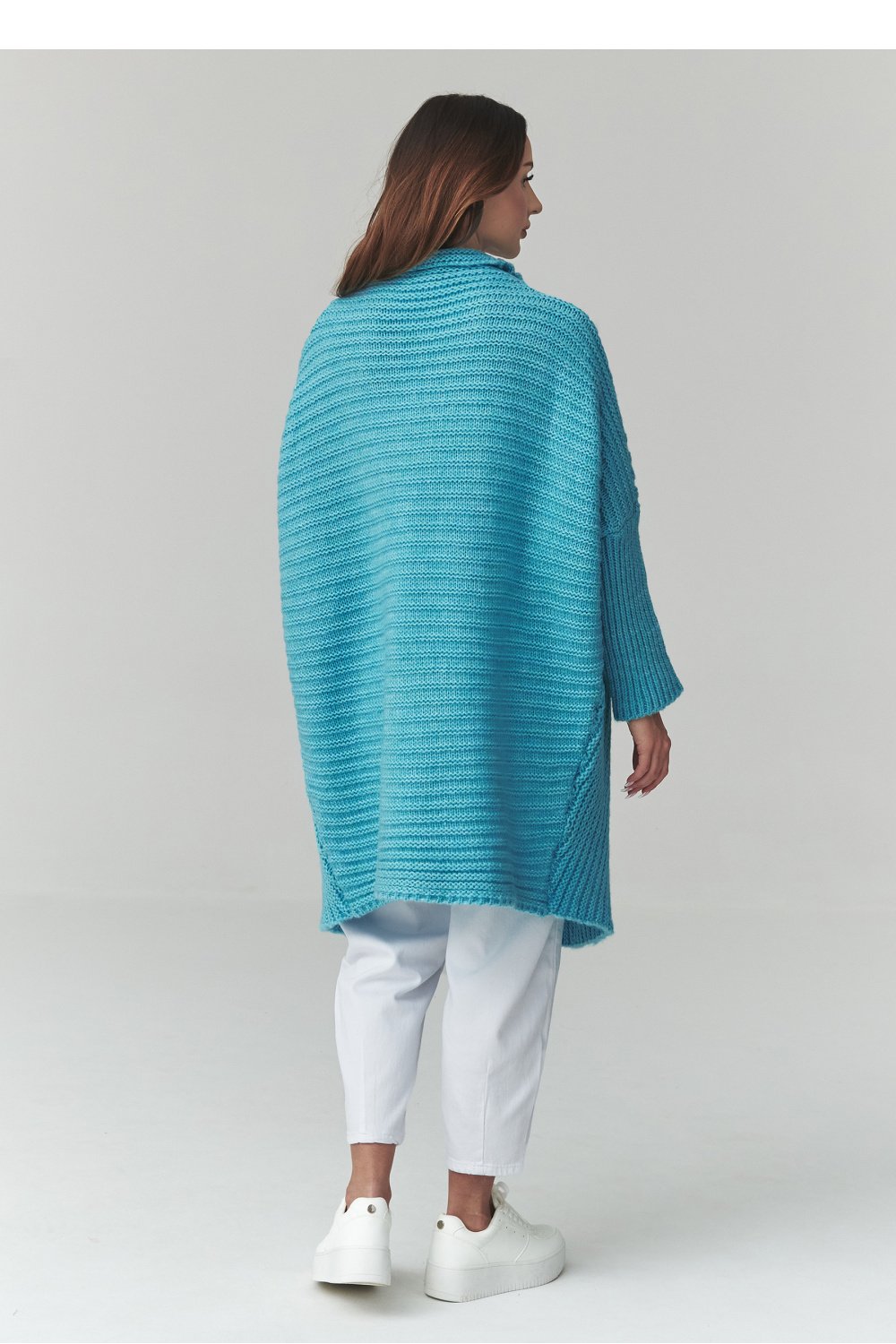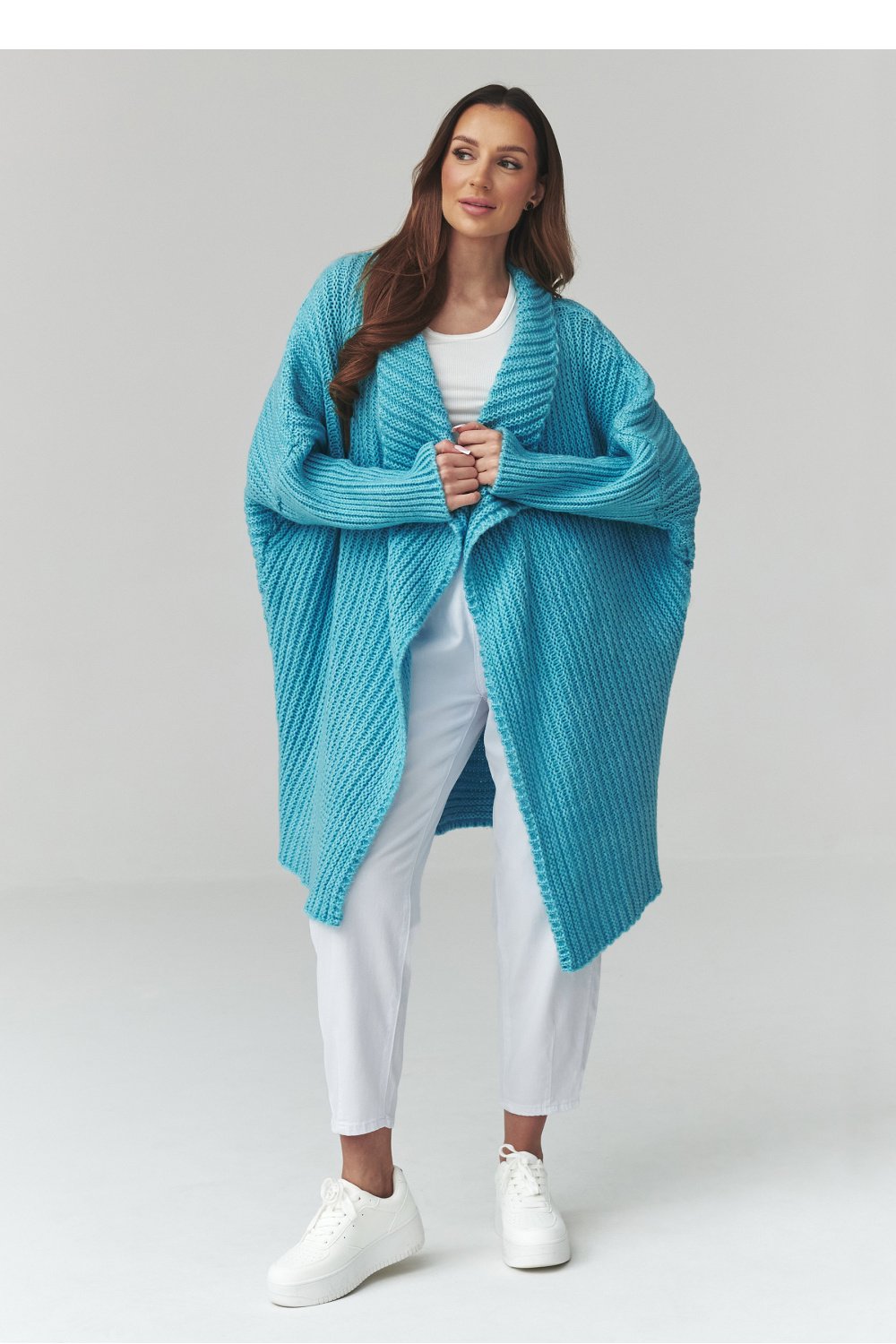 This long women’s sweater is a perfect choice for women who value comfort, style, and timeless design. The cardigan-style model stands out with its loose cut, which fits perfectly on the silhouette and provides full freedom of movement. The trendy oversized sweater will work great in both everyday stylings and more elegant combinations. Made of pleasant to the touch knitwear, the women’s cardigan ensures wearing comfort and proper insulation on cooler days. The characteristic material weave gives it a unique look, and the longer cut makes the long oversized sweater perfect for pants, leggings, or dresses. The versatile women’s sweater for everyday wear can be easily matched to many stylings, from casual to more urban ones. It is an ideal wardrobe piece for women looking for a fashionable women’s cardigan combining comfort and style.