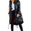 Oversized coat fastened with press studs. Made of slightly glossy, insulated fabric. Lined in a contrasting color. Fits into many urban stylizations. Available in two colours: deep black and silver.