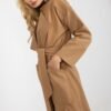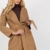 Thin women’s coat with long sleeves, unlined. The coat is unbuttoned, with a tie belt. Large patch pockets on the sides.