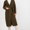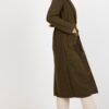 Women’s coat with long sleeves and patch slip pockets. The coat is unlined, buttoned, with a tie belt.